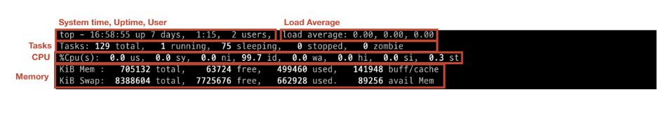 요약 영역은 top에서 상단에 위치하고 있습니다. 이 요약영역은 전체 프로세스가 OS에 대해서 리소스를 어느정도 차지하고 있는지를 알려줍니다. 요약 영역에 나타나는 대표적인 값은 시간, 유저, 로드 에버리지(Load Average), 테스크(Tasks), CPU, 메모리(memory)로 아래의 이미지를 보시면 각 영역에 대해 나태내느 값이 어디에 위치하는지 알 수 있습니다.