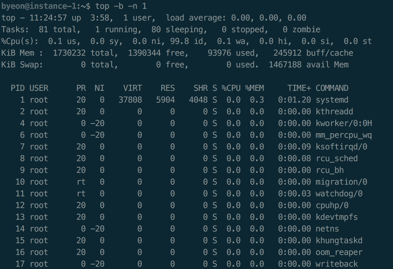 - 순간의 정보를 확인하려면 -b 옵션 추가(batch 모드)