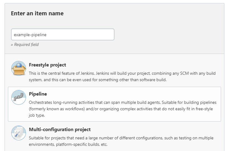 주의 : Jenkins는 이 항목 이름을 사용하여 디스크에 디렉터리를 만듭니다. 항목 이름에 공백을 사용하지 않는 것이 좋습니다.