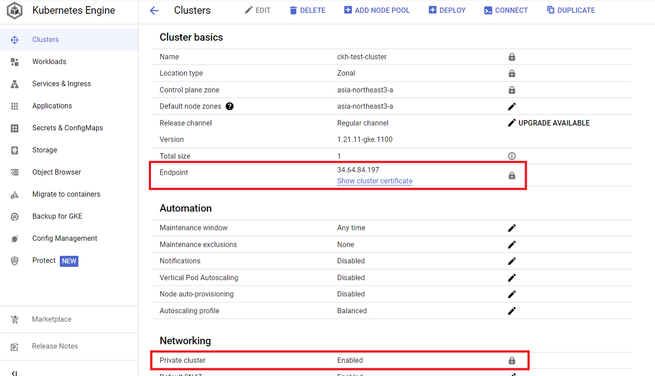 5) Private Cluster가 Public IP를 Endpoint로 생성된 것을 확인 할 수 있습니다. 이제 해당 IP에 대하여 GCP Network 밖에서도 접근이 가능합니다. 승인된 네트워크 설정을 하였음으로, 접근 가능한 IP범위는 승인된 네트워크 범위로 한정됩니다.