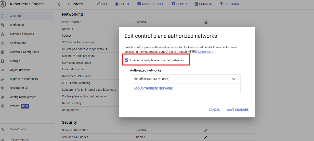 > Enable control plane authorized networks