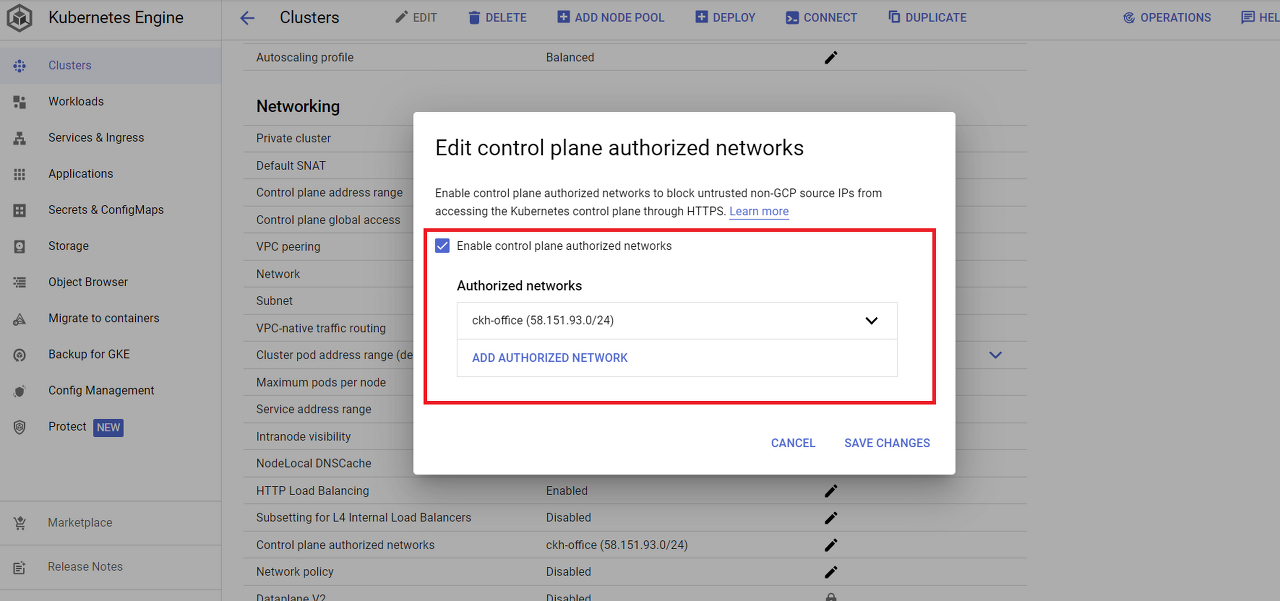2) GCP Console > Kubernetes Engine > Clusters >Edit > Networking > Control plane authorized networks