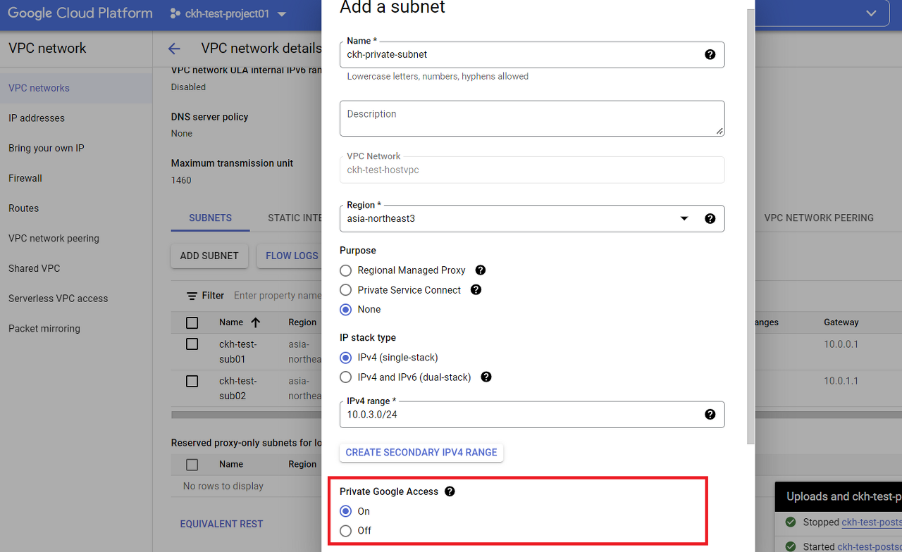 Private Cluster 생성 시 Node의 Subnet으로 사용될 Subnet을 Private Google Access를 활성화 하여 생성합니다.
