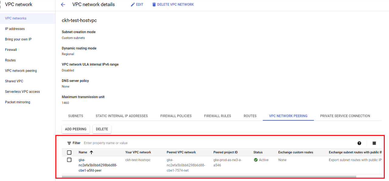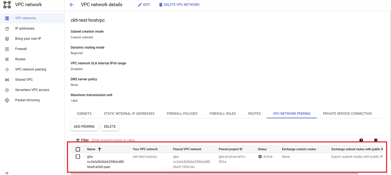 4) GKE Cluster를 생성한 VPC를 확인하여 제어 영역이 포함된 VPC가 피어링 되어 있음을 확인 할 수 있습니다.