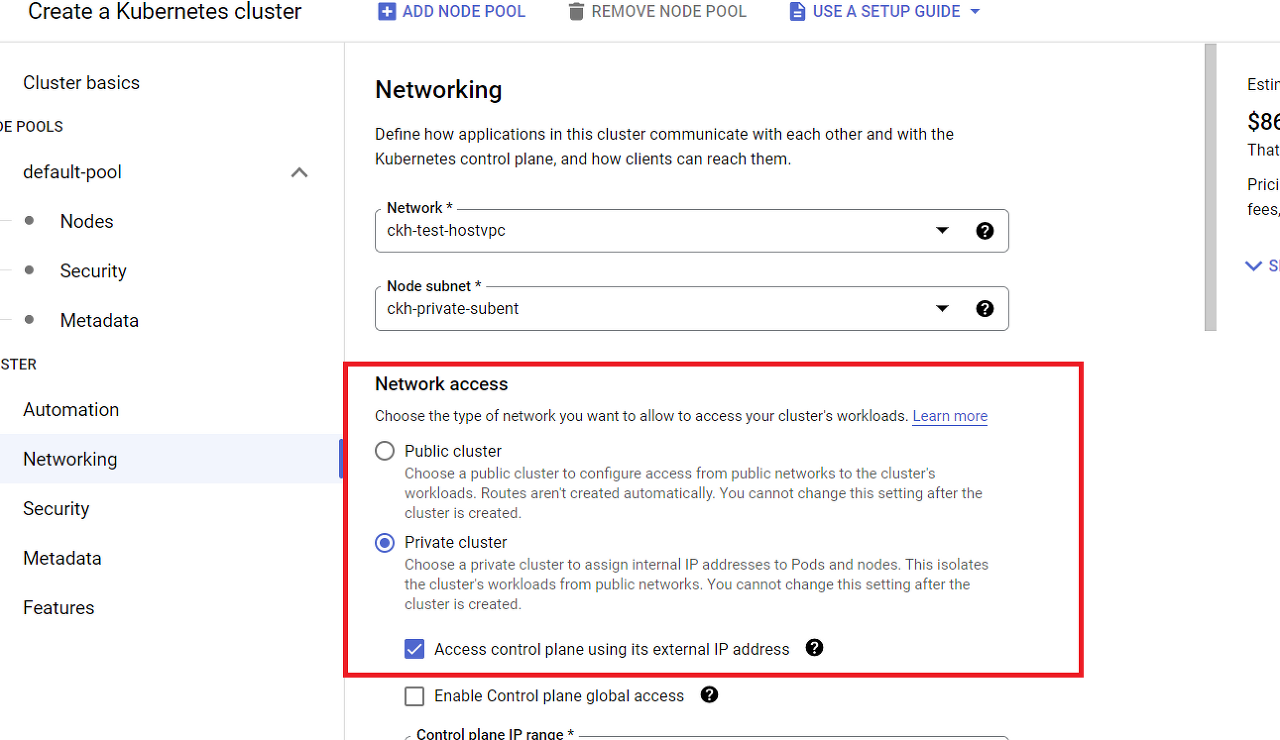 GKE Private Cluster를 생성합니다. 제어 영역을 외부 IP로 접속 설정을 활성화 합니다.