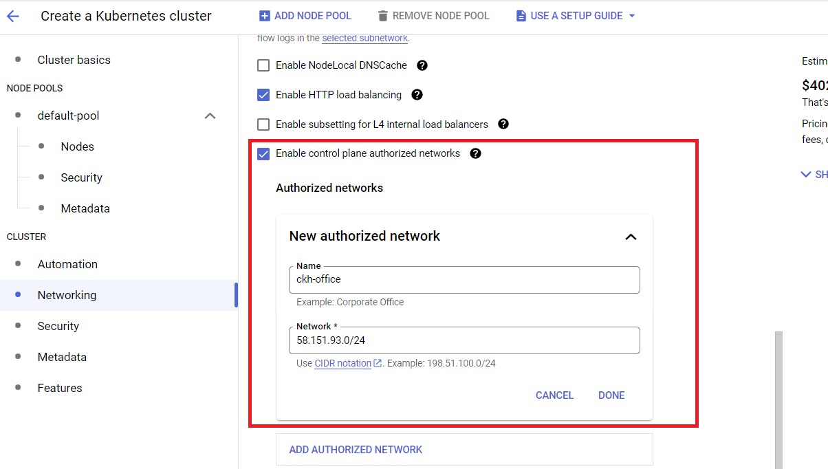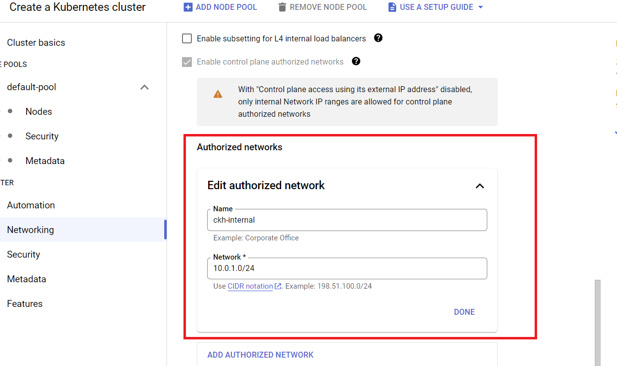 5) Cluster > Network > Control plane authorized networks 에서 승인된 네트워크 IP 범위를 추가할 수 있습니다.