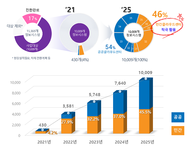 총 15,369개 정보 시스템 중 전환 대상인 10,009개 정보시스템을 2025년까지 클라우드로 전환·통합하여, 다양한 국민수요에 대응하고 안정저긴 대국민 서비스 제공을 위해 정보자원의 유연한 확장과 탄력적 대응을 도모할 예정이다.
