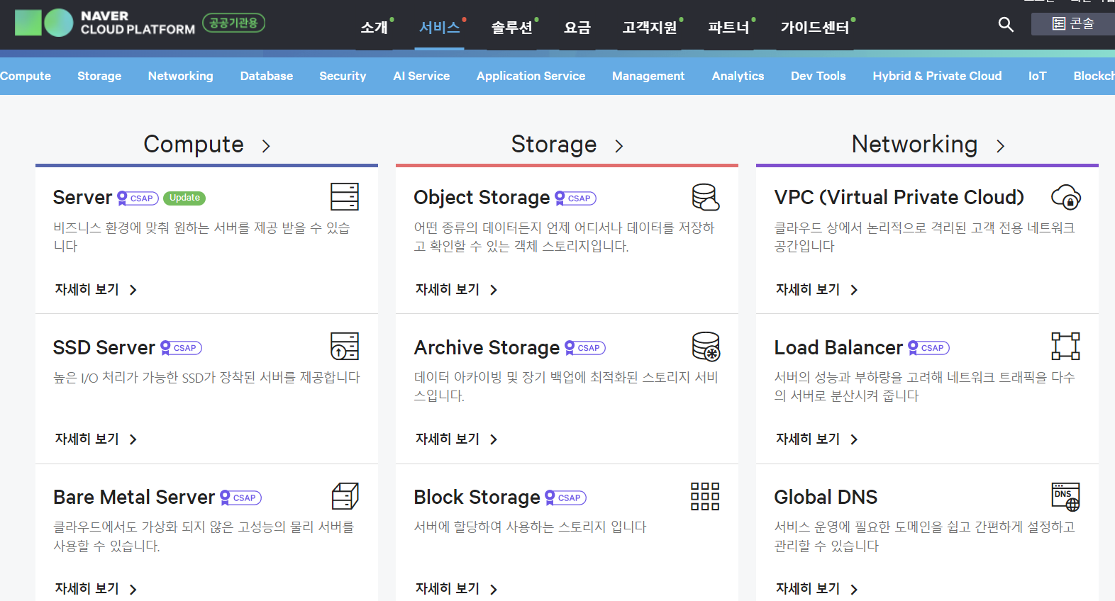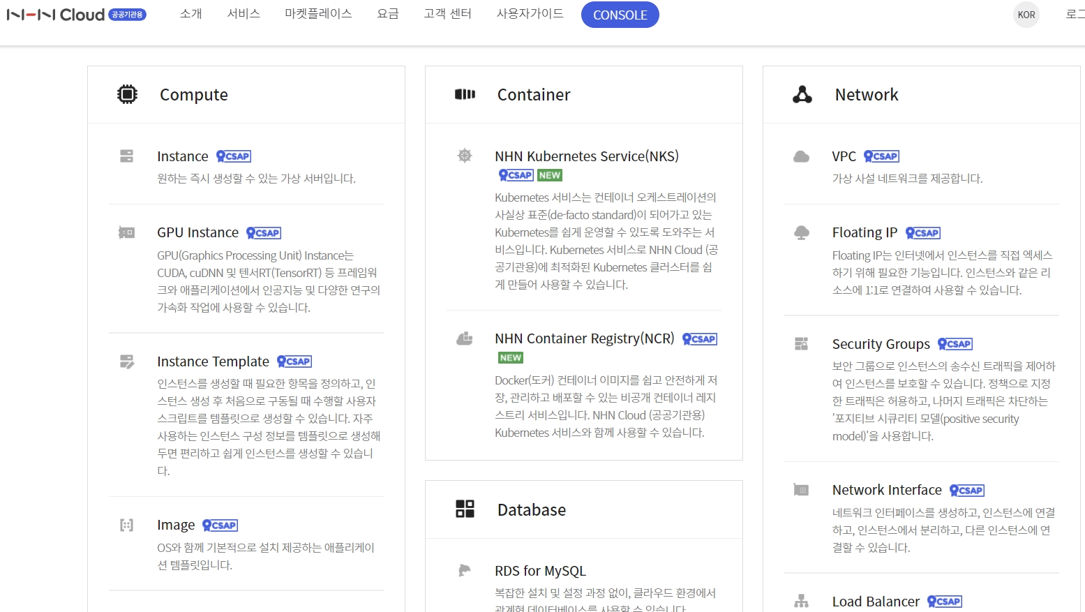 NAVER Cloud Platform (공공기관용)과 NHN Cloud (공공기관용) 홈페이지 접속 시 서비스 옆에 CSAP 인증이 붙어있는 것을 확인할 수 있다.