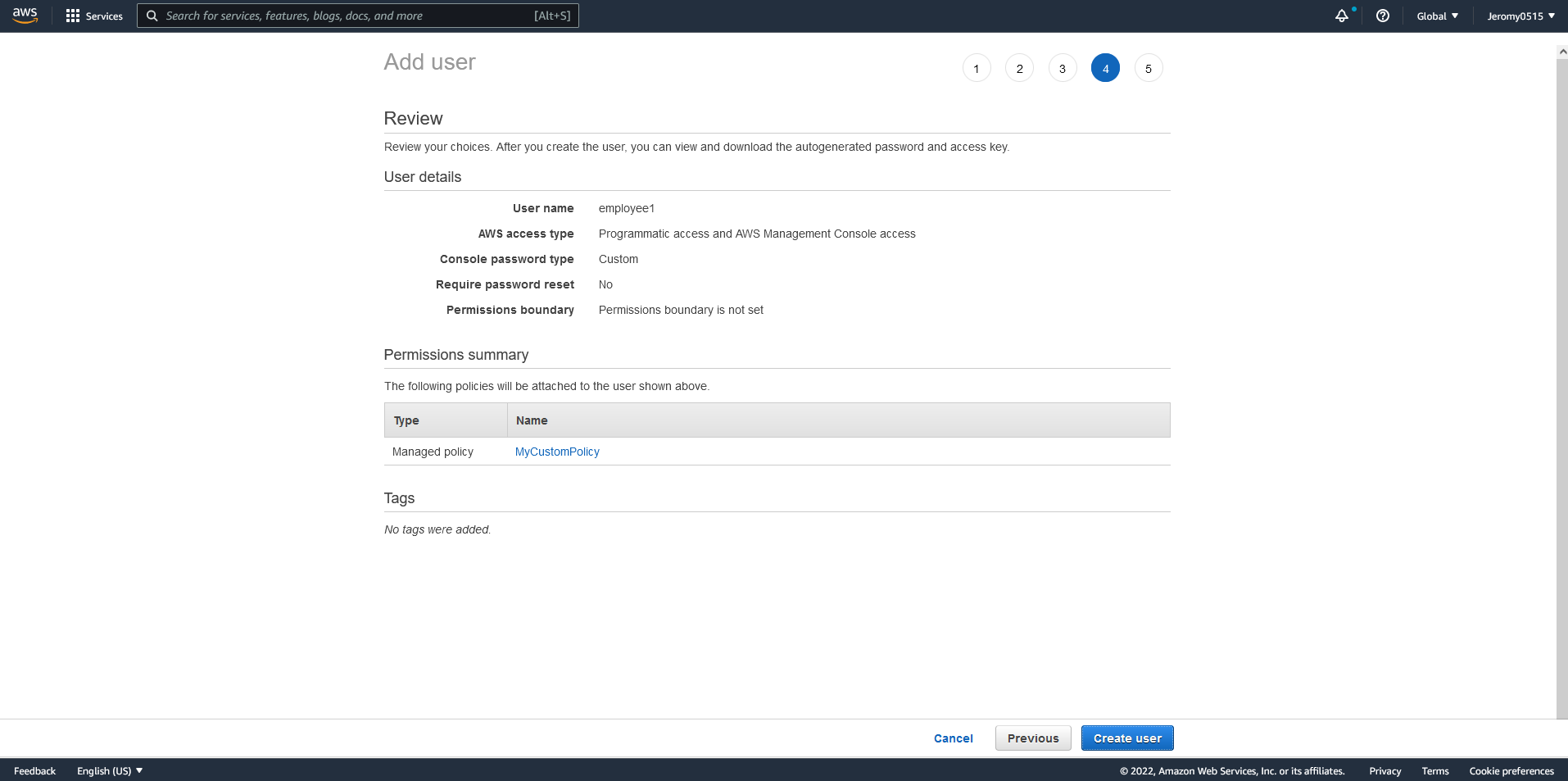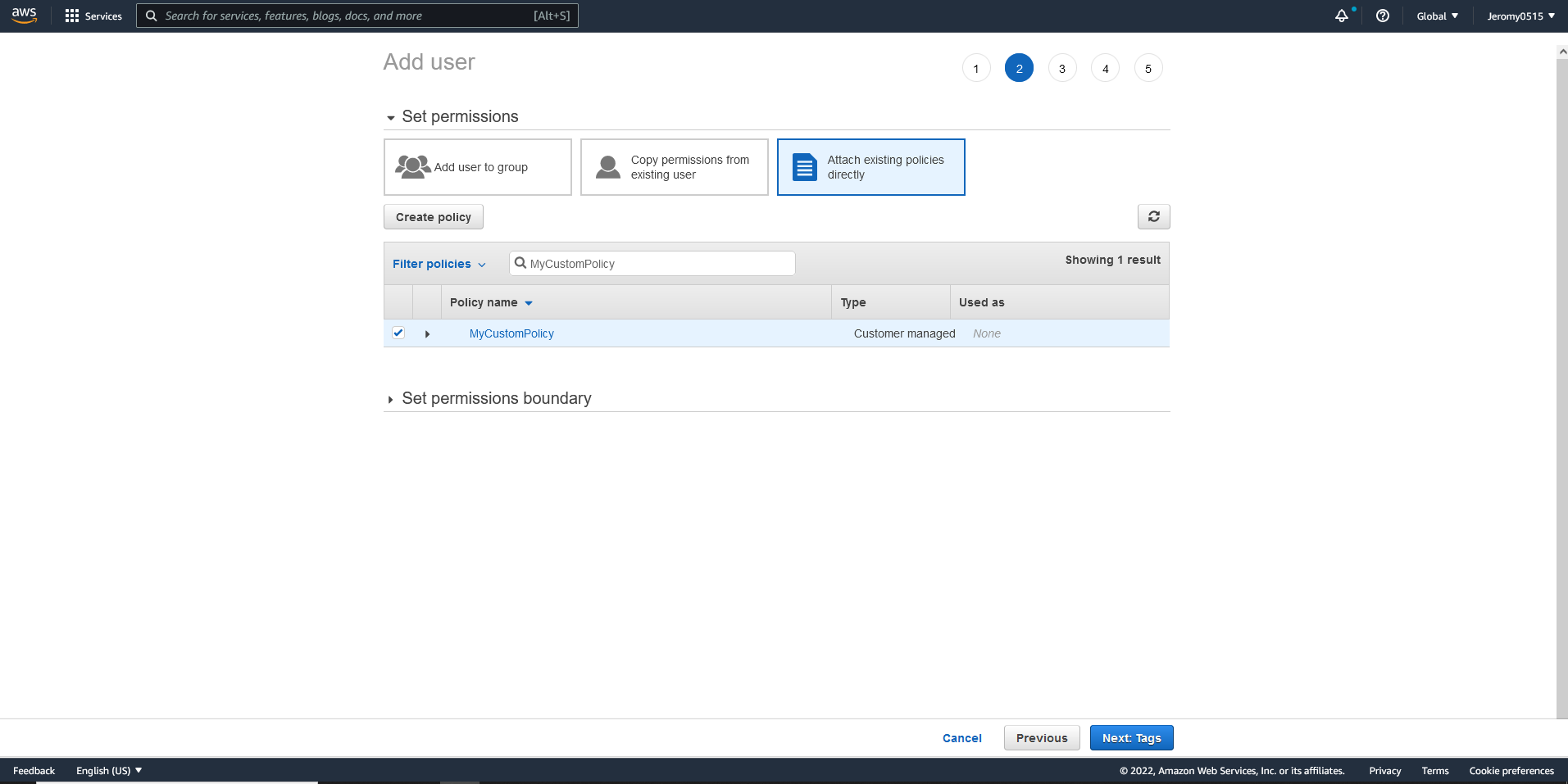 8. IAM-1 에서 공부했던 그대로 User(유저)를 생성한 후, 다음과 같은 화면이 보이면 방금 생성한 Policy를 지정해 줍니다.
