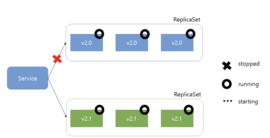 - 신규 pod가 정상적으로 실행되면 한꺼번에 트래픽을 옮기는 배포 전략
