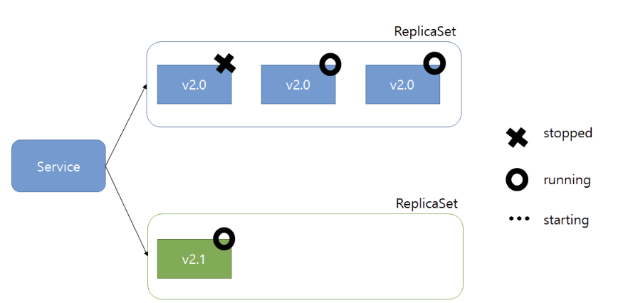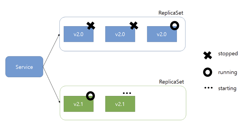 - 파드를 하나씩 죽이고 새로 띄우는 차례대로 교체하는 방법