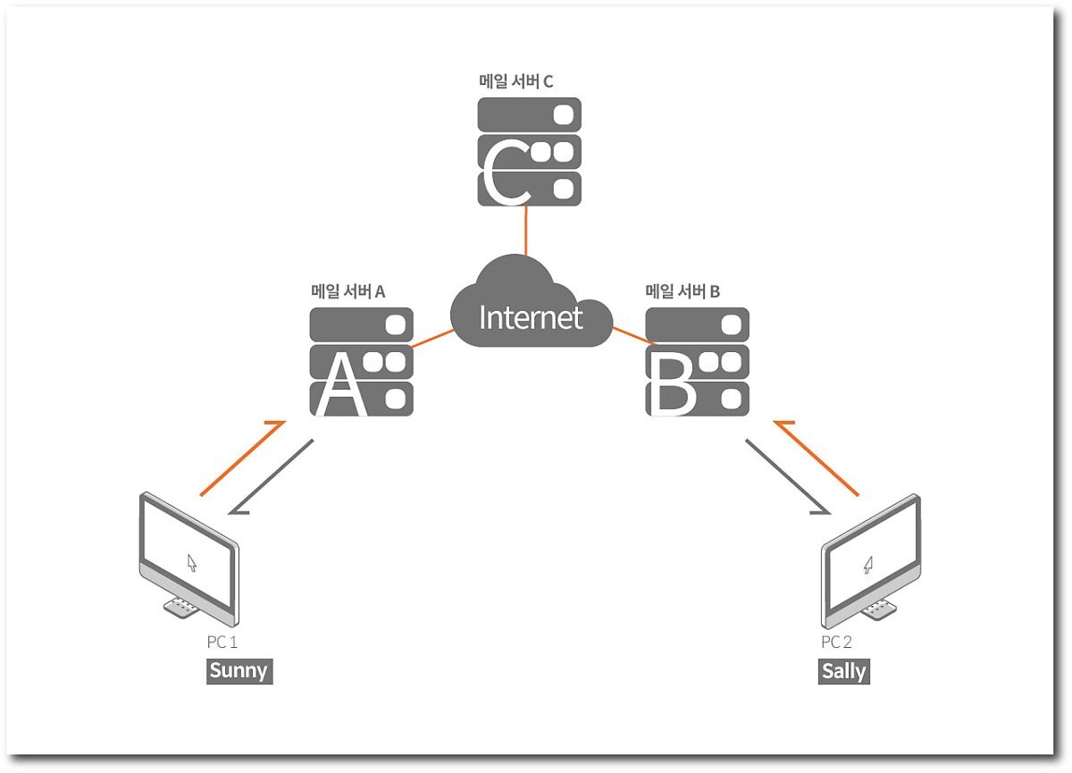 - 각각의 메일 주소에 대응하는 사서함(Mail box)이 존재