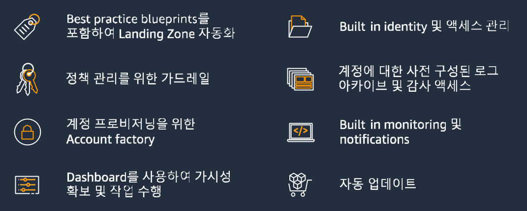 - 안전한 멀티 어카운트 AWS 환경을 제공하는 솔루션이다.