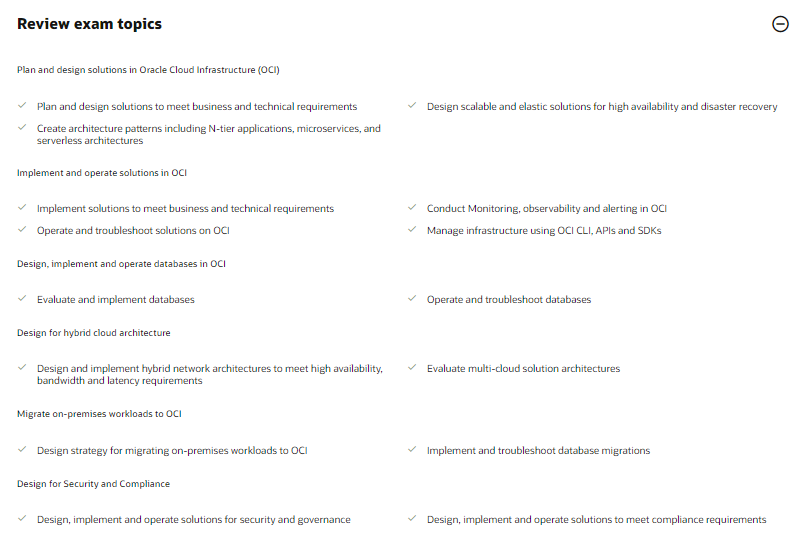 Oracle Cloud에서 제공하는 시험인 OCI[Oracle Cloud Infrastructure]는 Oracle에서 솔루션을 계획, 설계, 구현 및 운영하는 데 필요한 실무 경험과 지식이 필요합니다. Oracle Cloud Infrastructure Architect Professional 인증은 고가용성 및 재해 복구, 데이터 마이그레이션, 네트워크 연결, 모니터링, 데이터 보존, 스토리지 및 데이터베이스와 같은 인프라를 제어하는 OCI 서비스의 고급 개념을 검증합니다.