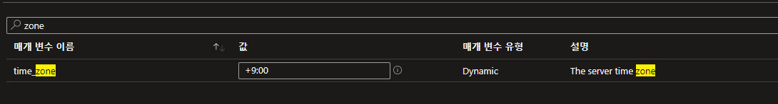 <서버 매개 변수> 탭으로 이동하여 필터링항목에 zone을 검색한 후, 다음과 같이 설정합니다.
