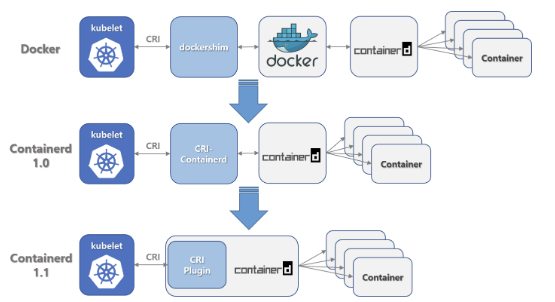 containerd1.1은 containerd에 내장 된 CRI 플러그인을 사용합니다. Docker 18.03 CE 통합은 dockershim을 사용합니다.