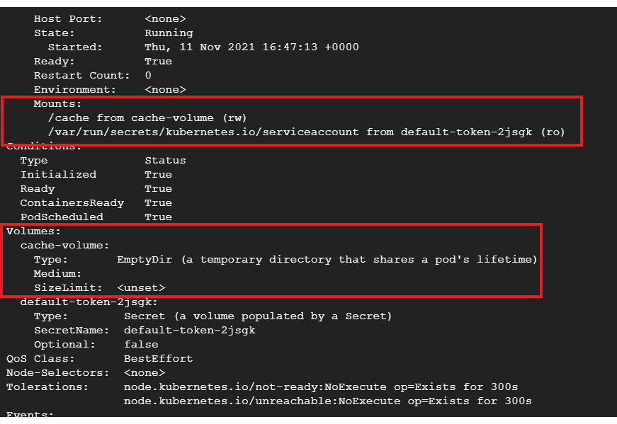 컨테이너 사양에는 cache-volume이라는 볼륨이 파일 경로 /cache에 마운트되도록 지정하는 volumeMounts: 필드가 포함됩니다.