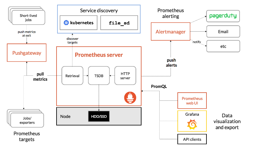 Prometheus는 단기 작업에 대해 직접 또는 중간 푸시 게이트웨이를 통해 계측 작업에서 메트릭을 긁습니다. 스크랩한 모든 샘플을 로컬에 저장하고, 이 데이터에 대한 규칙을 실행하여 기존 데이터에서 새 시계열을 집계 및 기록하거나 경고를 생성합니다. Grafana 또는 기타 API소비자를 사용하여 수집된 데이터를 시각화할 수 있습니다.