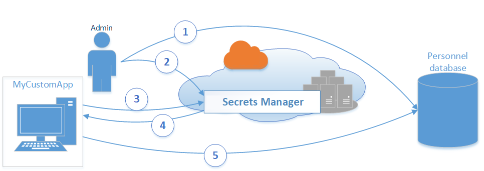 - MyCustomApp에서 데이터베이스에 액세스하는 경우 이 애플리케이션은 Secrets Manager에 MyCustomAppCreds라는 보안 암호를 쿼리합니다.
