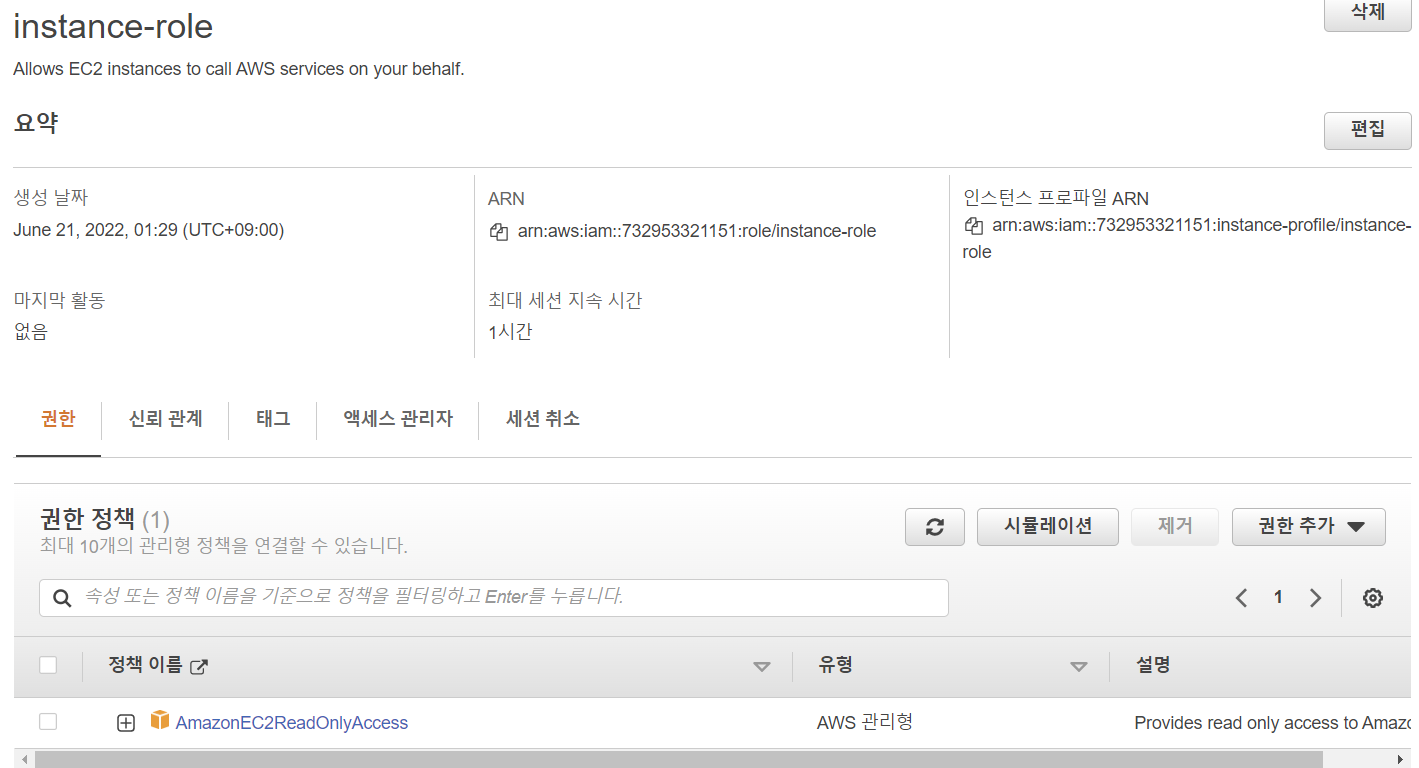 IAM Role을 생성하고 EC2 ReadOnly정책을 넣었습니다.