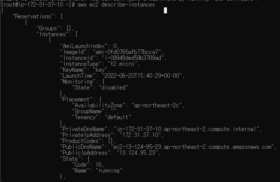 다시 aws ec2 describe-instances 명령어를 입력하니 정상적으로 출력됩니다.
