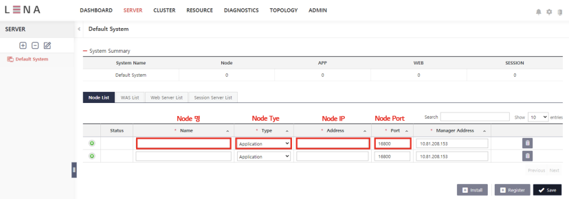 WAS Node와 Web Server Node를 설치하고 Agent를 기동하면 LENA Manager를 통해 Node를 등록할 수 있다. LENA Manager의 상단 'SERVER' 메뉴를 선택하면 Node List를 확인 할 수 있다. Node 등록을 위해 'Register' 버튼을 클릭하면 아래와 같이 Node를 등록하기 위한 Empty Row가 추가되며 각 입력 항목을 등록한다.