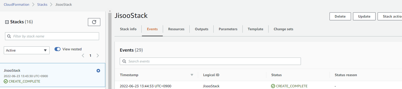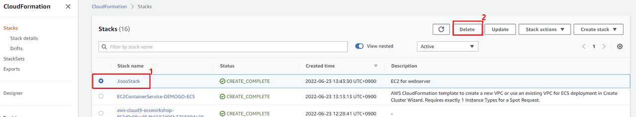 생성한 스택을 선택하여 delete만 누르면 스택삭제가 완료됩니다.