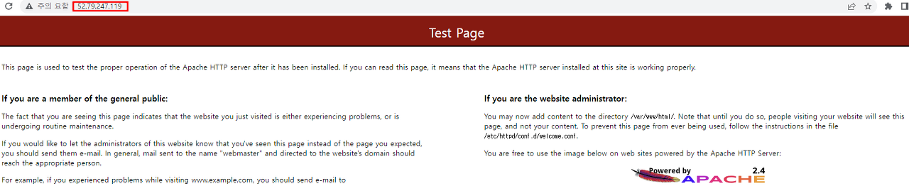 Apache Test Page가 잘 나오는것을 확인할 수 있습니다.