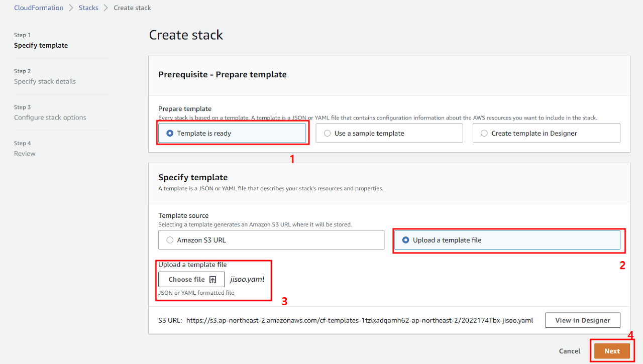 순서대로 체크를 해주고 "Upload a template file" 에는 완성된 yaml 파일을 업로드해줍니다.
