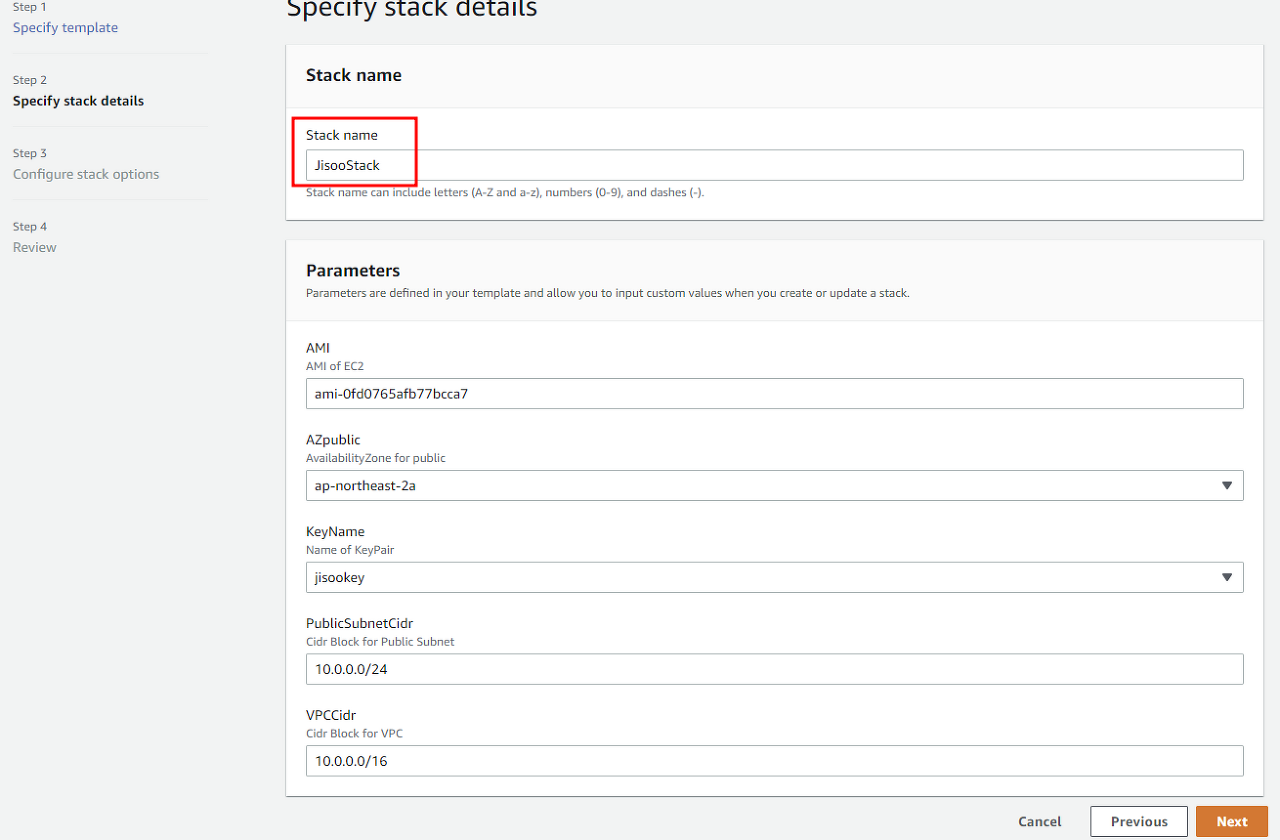 VPC Cidr 은 10.0.0.0/16 으로 PublicSubnet Cidr은 10.0.0.0/24로 디폴트 값을 지정해주었습니다.