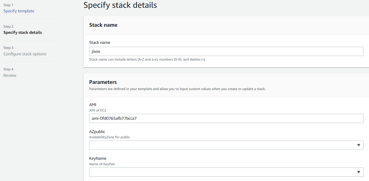 AMI도 리전별로 원하는 OS별로 다르기 떄문에 파라미터로 넣었지만, 드롭다운 값 목록을 표시하지 않기 때문에 디폴트 값을 넣어줬습니다.