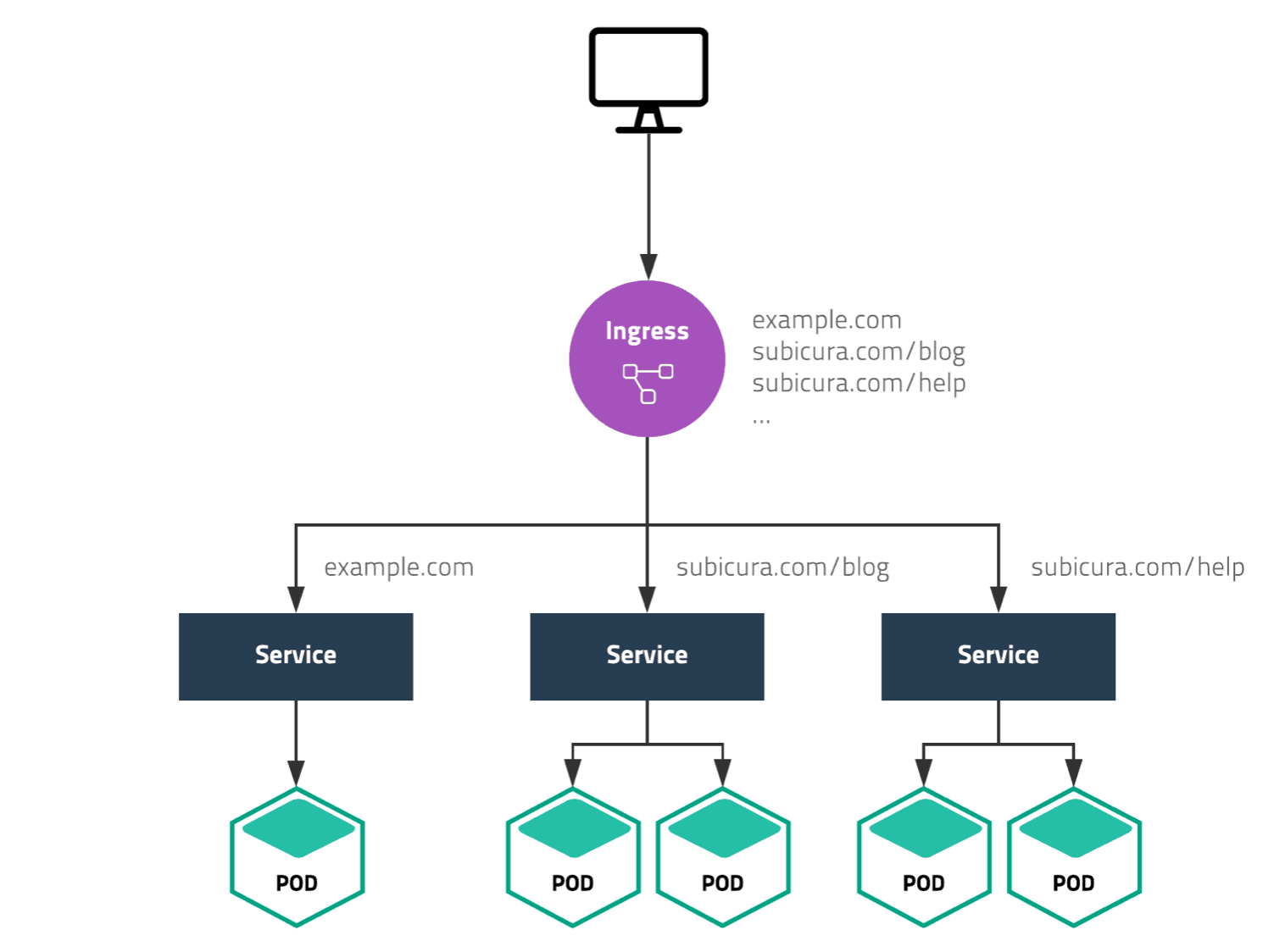 위 샘플은 example.com, subicura.com/blog, subicura.com/help 주소로 서로 다른 서비스에 접근하는 모습입니다. 80(http) 또는 443(https) 포트로 여러 개의 서비스를 연결해야 하는데 이럴 때 Ingress를 사용합니다.
