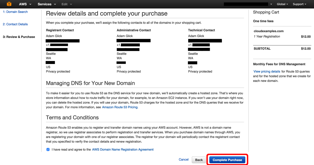 4.정리되어 있는 세부 정보를 검토하고 틀린 내용이 없는 경우, I have read and agree to the AWS Domain Name Registration Agreement라는 제목의 확인란을 선택합니다. 그런 다음 구입 완료 버튼을 클릭합니다.