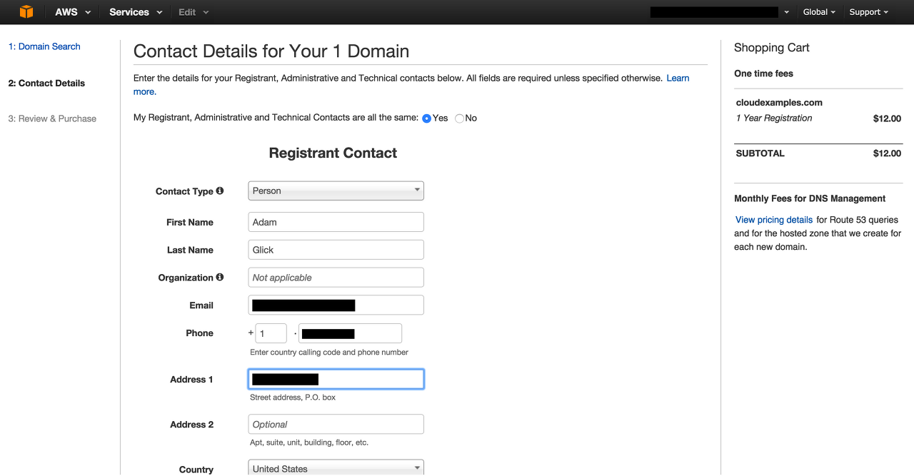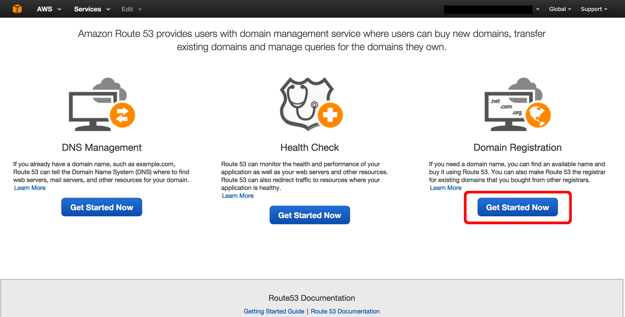 참고: 이 예제에서는 새로운 도메인 이름을 확보하고, 방금 생성하여 인스턴스에 연결된 탄력적 IP 주소에 이를 연결하겠습니다. 도메인 이름이 이미 있거나 다른 도메인 등록 대행자를 통해 도메인 이름을 확보하려는 경우, 3단계로 바로 이동해 주세요.