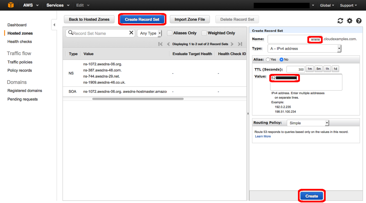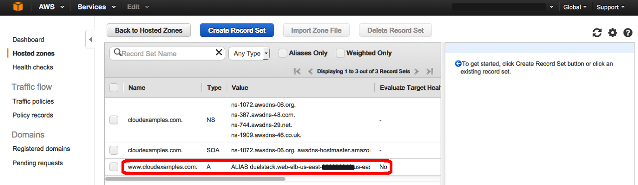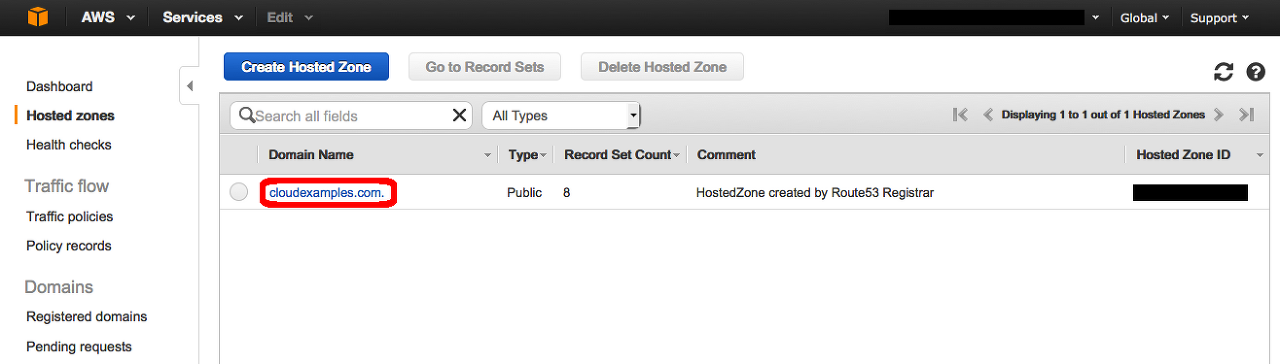 1.Route 53 콘솔의 호스팅 영역 부분을 엽니다. 그런 다음 2단계에서 생성한 도메인 이름을 클릭합니다(이 예제에서는 cloudexamples.com을 사용하고 있지만, 사용자의 도메인은 다른 이름입니다).