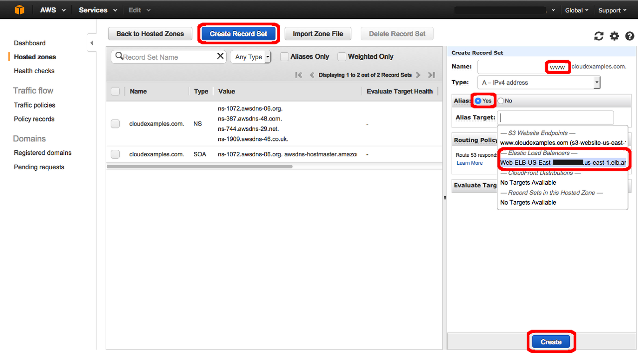 레코드 세트 생성 버튼을 클릭합니다. 창의 오른쪽에 있는 이름 텍스트 상자에 www를 입력합니다. 그런 다음 Alias 설정에서 예를 선택합니다. Alias Target 상자가 표시됩니다. Alias Target 상자를 클릭하면, 사용할 수 있는 리소스 목록이 보입니다. 가리키려고 하는 리소스를 선택합니다. 해당 리소스는 Elastic Load Balancers 아래에 있으며, Elastic Beanstalk에서 배포한 애플리케이션에 연결된 리소스여야 합니다. 그런 다음 [생성]을 클릭합니다.