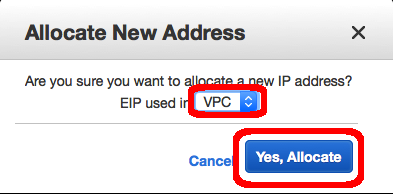 2.[EIP used in:]을 [VPC]로 설정하고 [Yes, Allocate]를 클릭합니다.