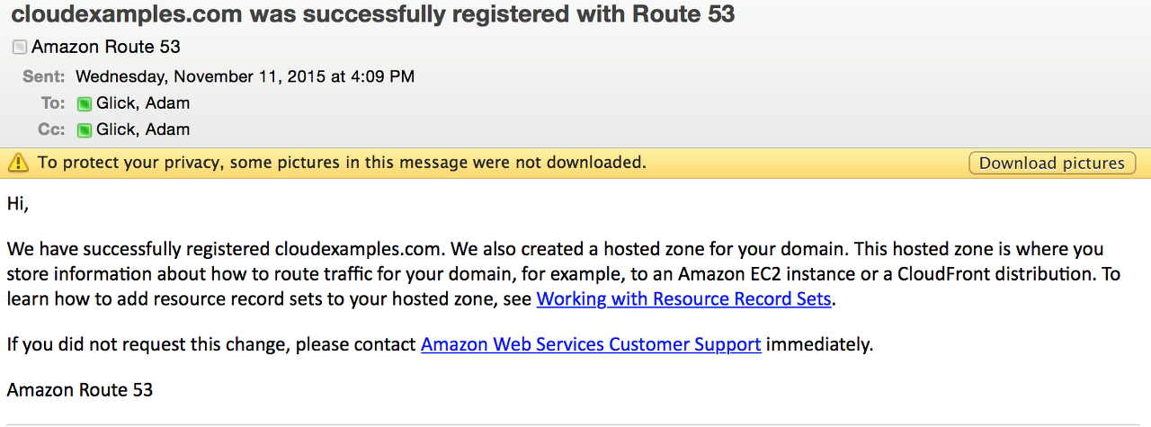 5. 일반적인 최상위 도메인(.com 등)이 포함된 도메인을 등록한 경우, 이메일 주소 확인을 요청하는 이메일을 받게 됩니다. (AWS에서 사용자의 이메일 주소가 유효한지 이미 확인한 경우에는 이메일을 전송하지 않습니다.)