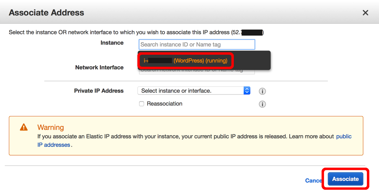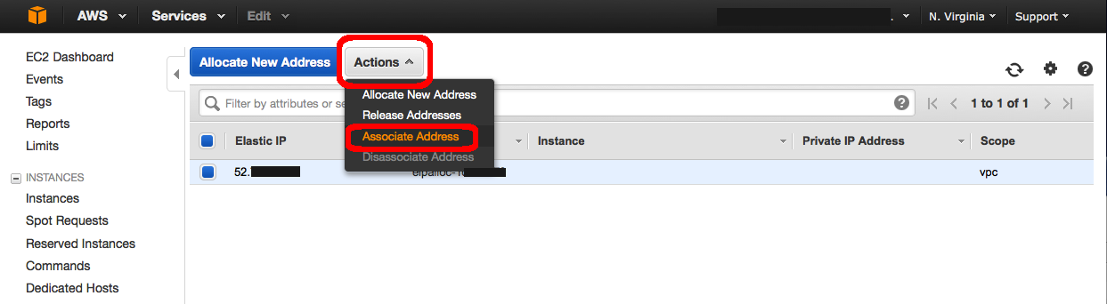 4.[Elastic IP] 열에서 새 IP 주소를 선택합니다. 작업 버튼을 누르고 Associate Address 옵션을 선택합니다.