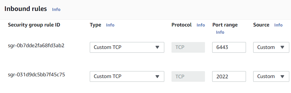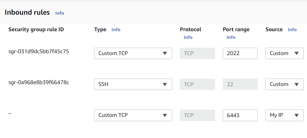 security - security groups 에서 새 규칙을 만든 후 Inbound 포트 : 22, 2022, 6443 을 허용해줍니다.