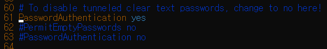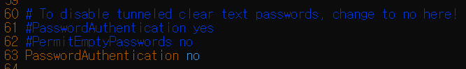 기본적으로 63번째 줄에 PsswordAuthentication no로 설정되어 있습니다.