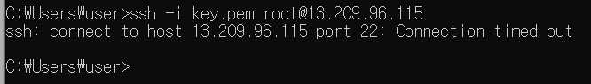 이 상태에서 SSH접근을 하면 Connection timed out 에러 메시지가 나옵니다.