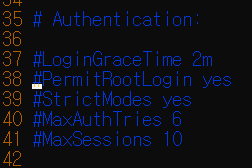 38번 줄에 PermitRootLogin yes로 주석 처리되어있지만 default 값으로 root 접속이 yes입니다.