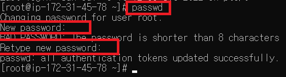 root계정으로 passwd 명령어를 입력하고 원하는 비밀번호를 2번 쳐줍니다.