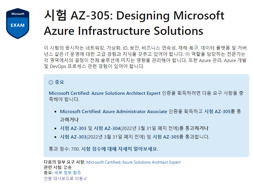 https://docs.microsoft.com/ko-kr/learn/certifications/exams/az-305 에서 가능하며