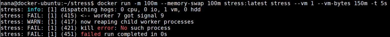 docker run -m 100m --memory-swap 100m stress:latest stress --vm 1 --vm-bytes 150m -t 5s