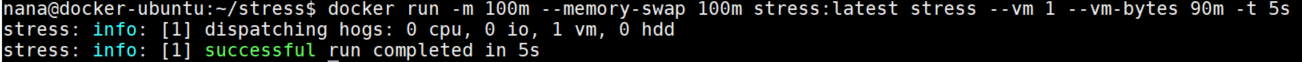 docker run -m 100m --memory-swap 100m stress:latest stress --vm 1 --vm-bytes 90m -t 5s
