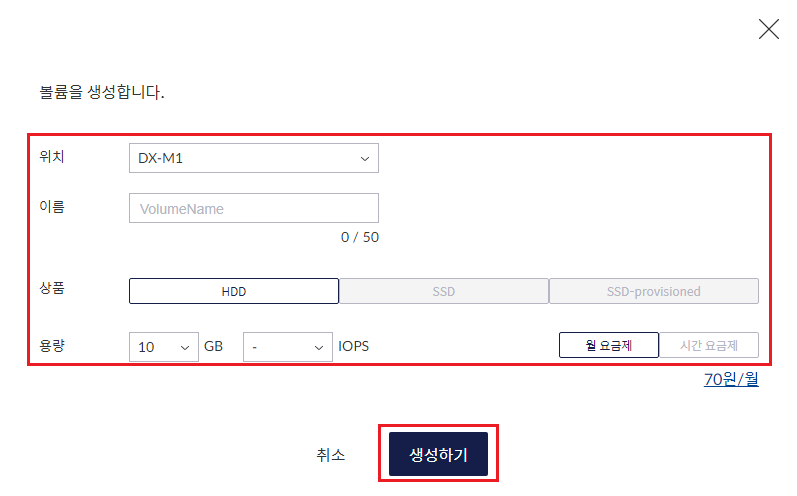 HDD 기반의 볼륨을 지원하며, 볼륨은 10GB 단위로 생성이 가능합니다.