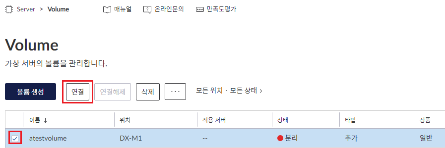 생성한 볼륨을 선택하고 [연결]을 클릭합니다.