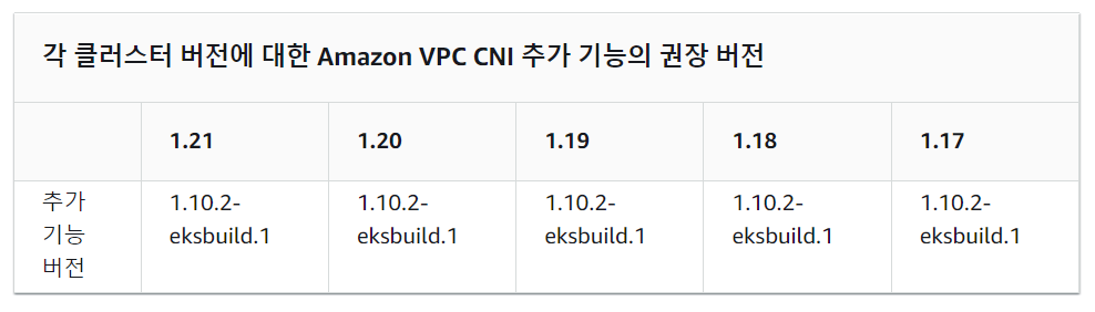 Amazon EKs 각 클러스터 버전에 대한 Amazon VPC CNI 추가 기능의 권장 버전이 있습니다.